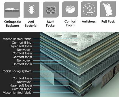 ორთოპედიული, ანტიბაქტერიული, ინდივიდუალურად შეფუთული ზამბარები, კომფოტული ქაფი, ანტისტრესი.