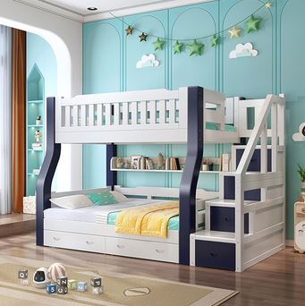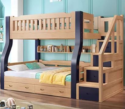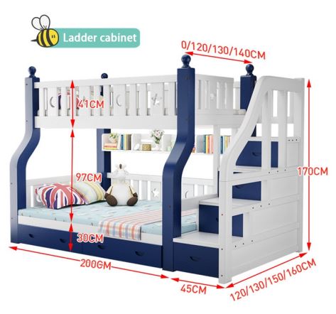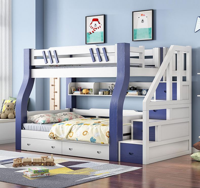 ორ სართულიანი საწოლი A2-2 ნატურალური ხე, ზედა 200*100 სმ, ქვედა 200*120 სმ, ცისფერი და თეთრი ფერი