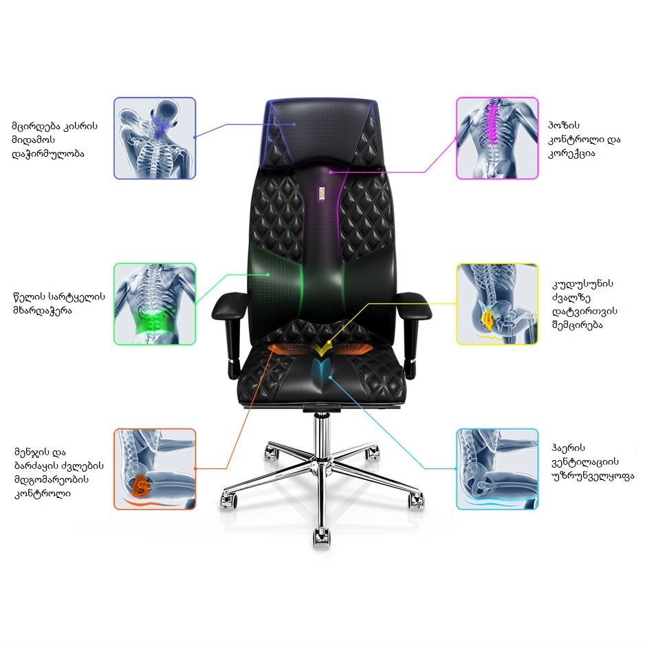 სავარძლის დიზაინი იმეორებს მომხმარებლის სხეულის ბუნებრივ ანატომიურ კონტურებს, ხსნის დაძაბულობას, სწორად ანაწილებს დატვირთვას, ინარჩუნებს პოზას და უზრუნველყოფს კომფორტის ზრდას.