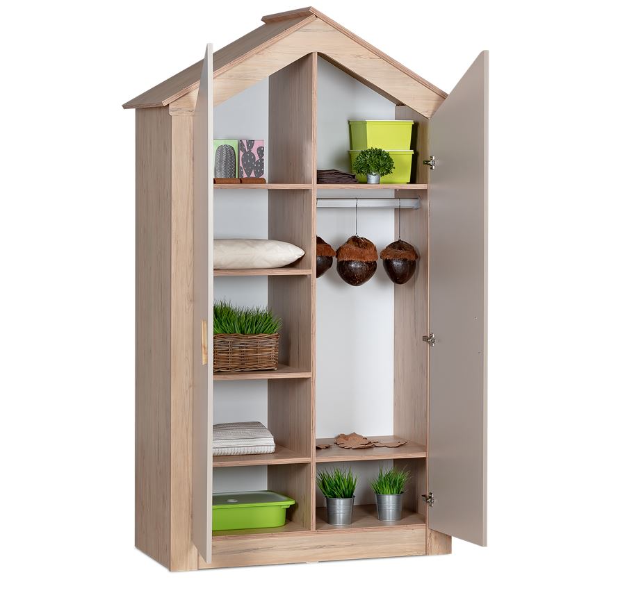 კარადა 2 კარებიანი საბავშვო ოთახი ‘ერგო ჩემი სახლი’ თაროებით მარცხენა მხარეს და საკიდისა და თაროების განყოფილებით მარჯვნივ, უზრუნველყოფს დიდ შესანახ ადგილს.