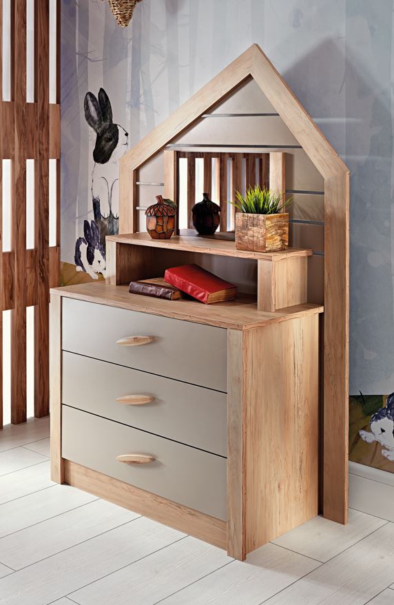 კომოდი საბავშვო ოთახი ‘ერგო ჩემი სახლი’ არის მარტივად გამოსაყენებელი, აქვს დიდი შიდა მოცულობის უჯრები და სარკის დეტალები.